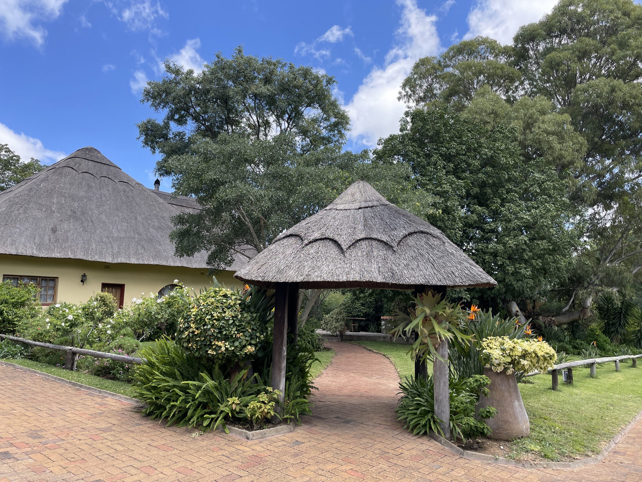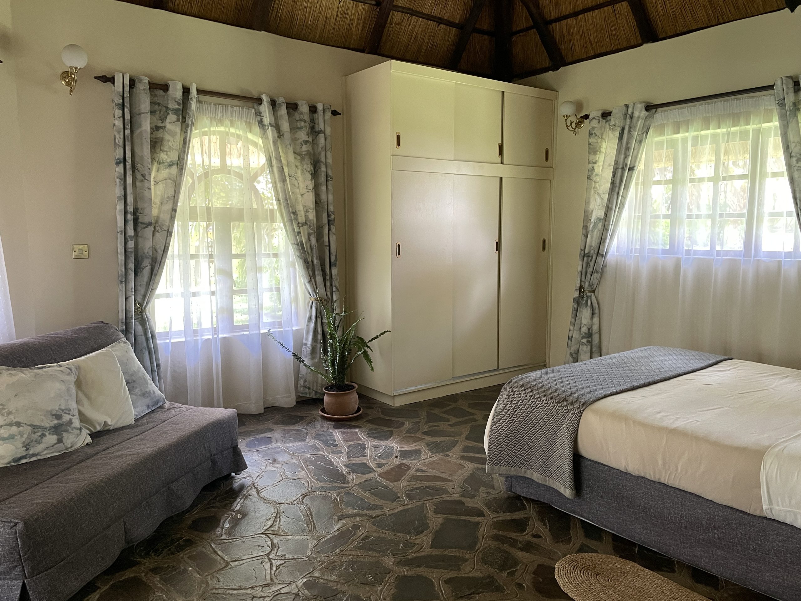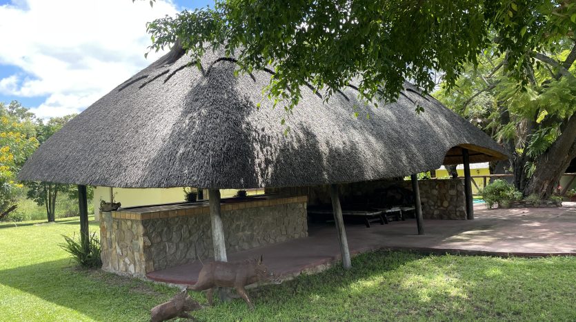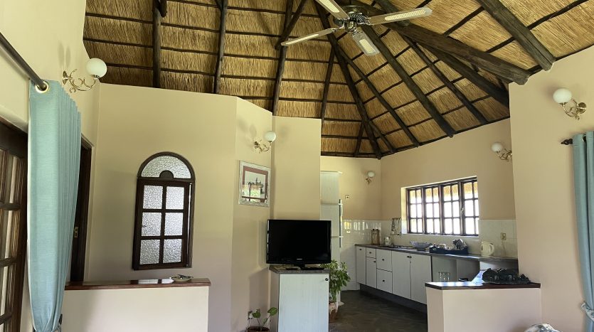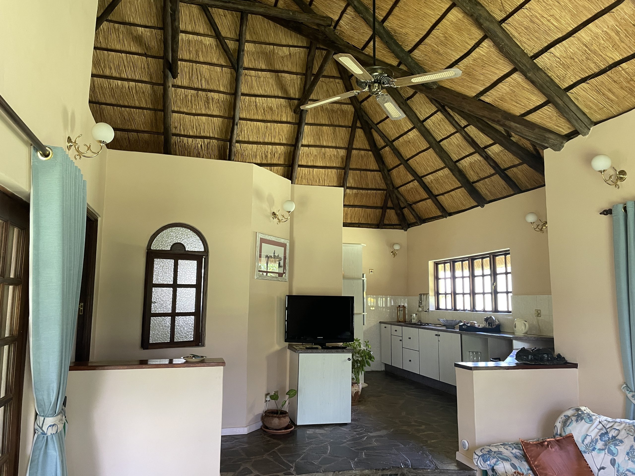 The lodge itself comprises five fully self-contained cottages, all in thatch, a large dining/seating area with offices and kitchen, and a manager room with bathroom. The furniture has been tastefully selected and the rooms are very neatly set out. The lodge is well maintained and offers a swimming pool, a hard surface tennis court with flood lights, gazebo and braai areas, there is also a thatched car port that can fit four vehicles.