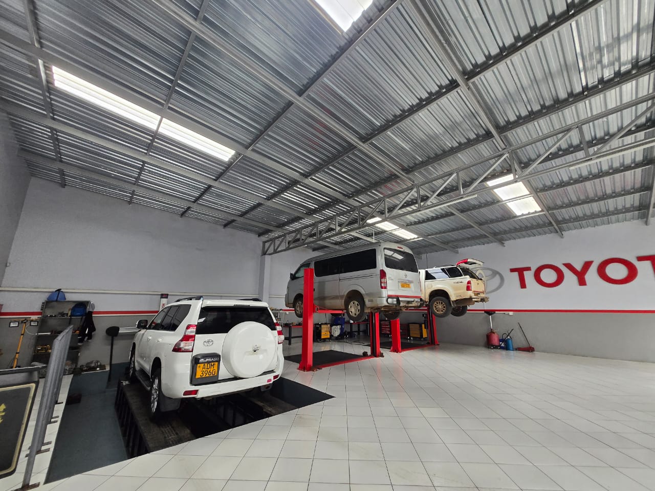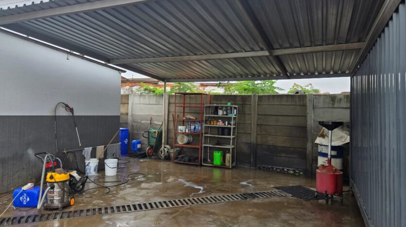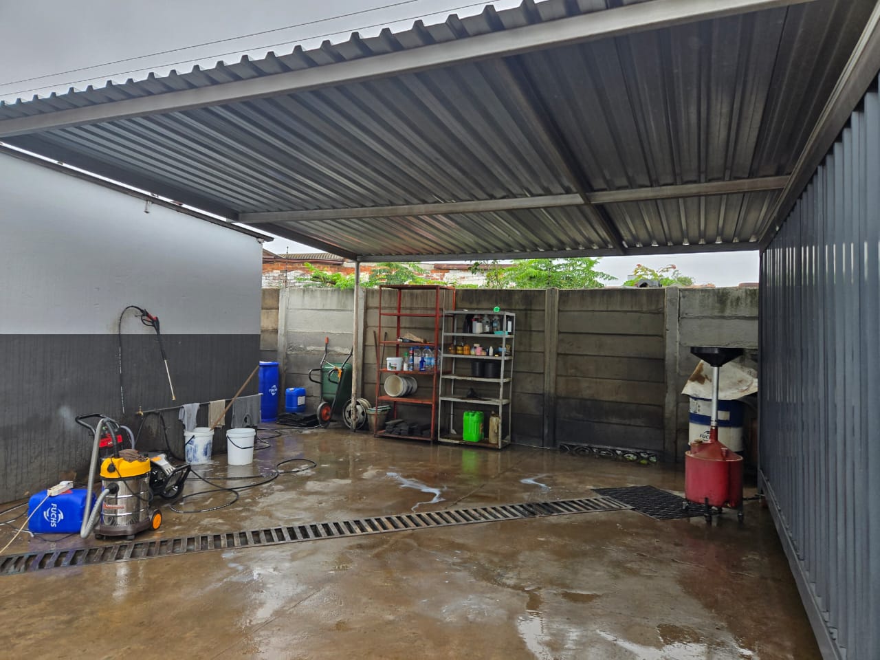 The fully tiled workshop includes a service pit and roll-up garage doors for easy access, complemented by a double carport. Staff amenities include separate male and female bathrooms and change rooms, a staff kitchen, and three staff rooms at the rear. The property is walled on three sides, secured with electric fencing and CCTV (indoor and outdoor), and further supported by a 3.5kVA solar system and an equipped borehole.